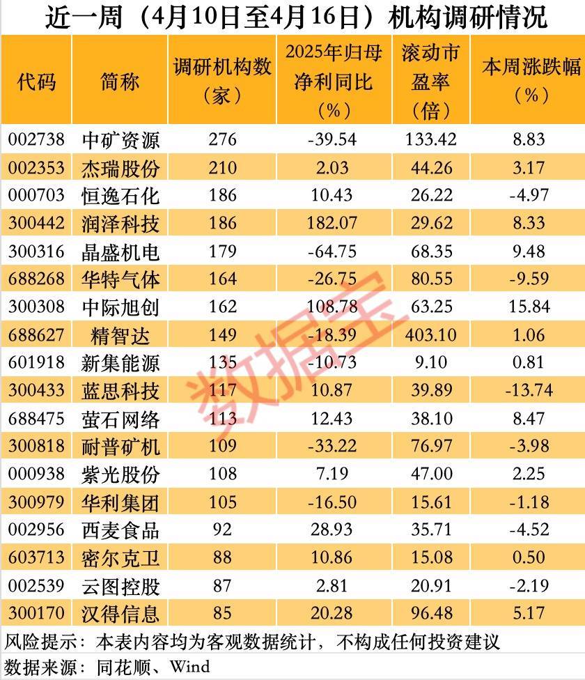近一周(4月10日至4月16日)机构调研个股有 350 多只,中矿资源获调研机构数量居首。